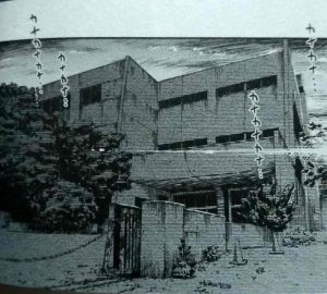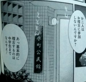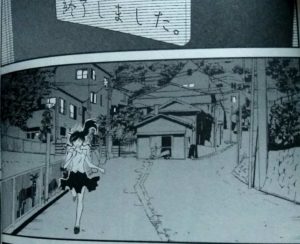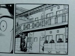 これは1巻の最初のシーンですがマンホールの位置や白線の曲がり具合、さらに先程の金目さんが二階から神輿をみているシーンの位置からしてまず間違いないです。